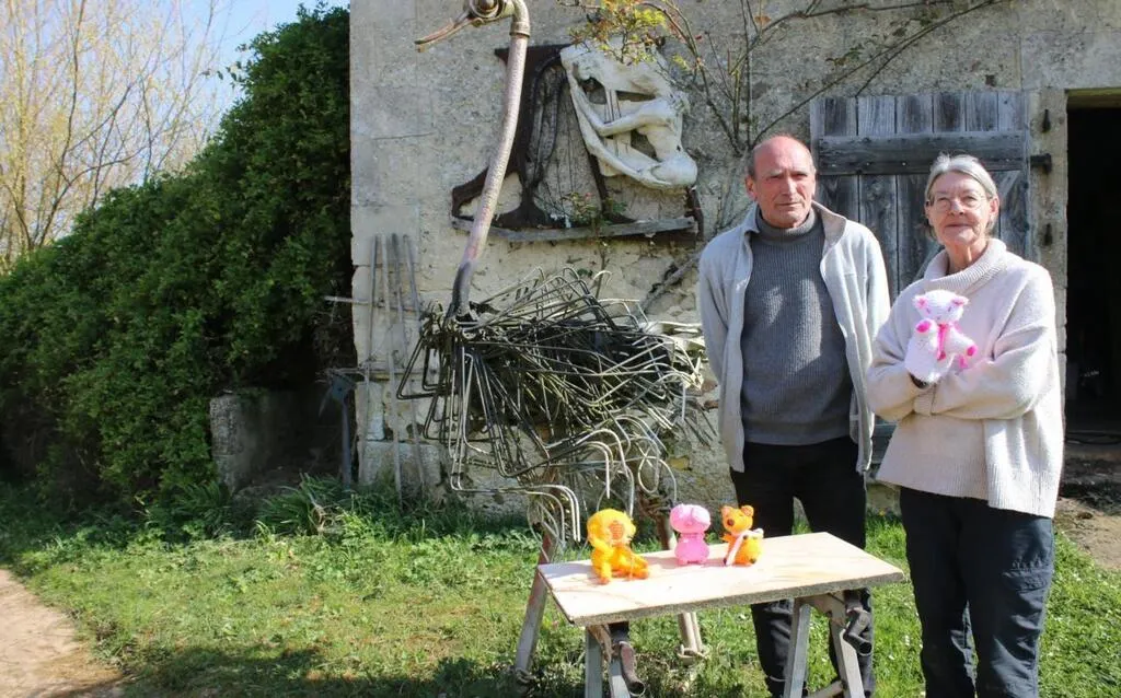 Sophie et Alain Bouvet, devant leurs réalisations d’art, les figurines et une autruche, qui a valu à Alain le prix Louis-Derbré. © Le Maine Libre