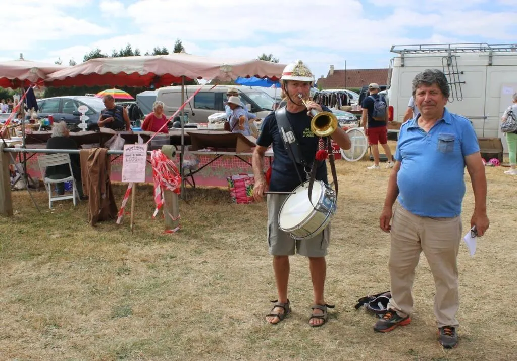 Avec son clairon et son tambour, Jean-Pierre Camus, ancien sapeur-pompier alençonnais, accompagné de Jean-Yves Porte, a apporté une petite note musicale au cours du vide-greniers. © Le Maine Libre