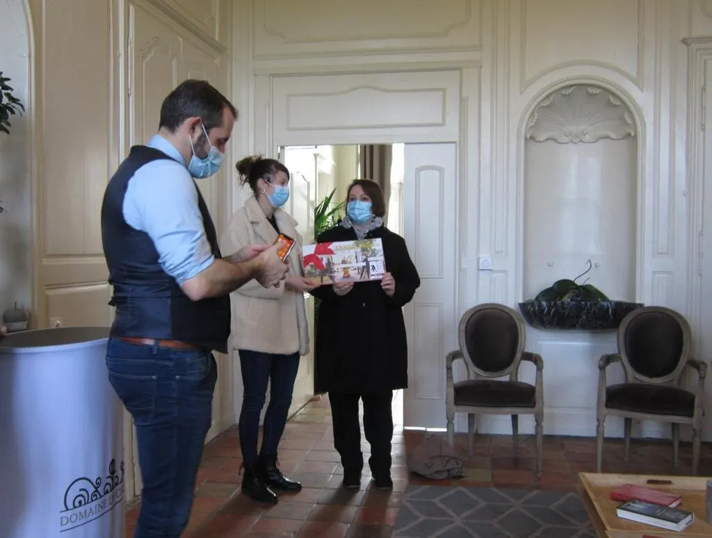 Maurane, l’heureuse gagnante, remet à Sophie de l’association Au chat zen le prix en présence de Michel Da Costa. © Le Maine Libre