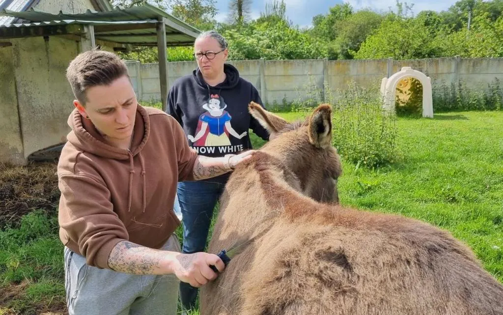 Tiphanie et Corinne étrillent l’âne Horace, pensionnaire depuis vingt-neuf ans au refuge de Gueuzay. © Ouest-France