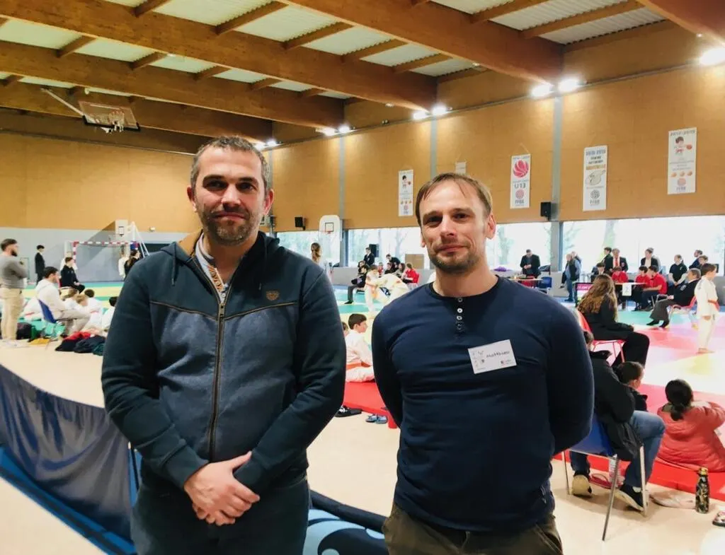 Vincent Leray (à gauche) et Matthieu Duchemin (à droite), réunis pour organiser la journée de compétitions de judo à la salle omnisports. © Le Maine Libre