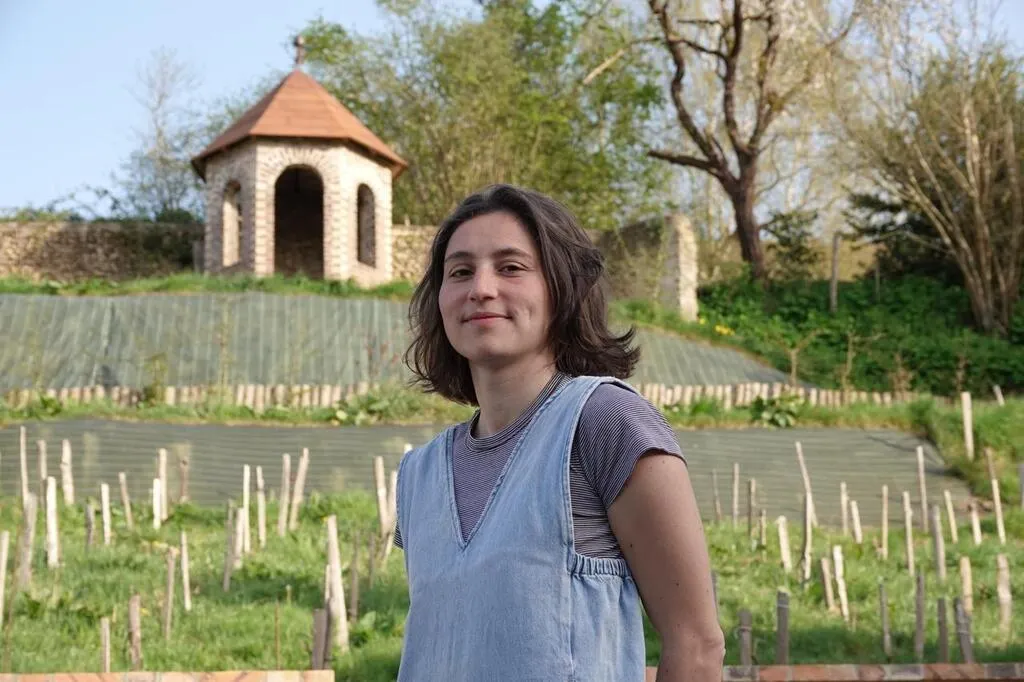 Adèle Yon, auteure du roman « Mon vrai nom est Elisabeth », ici devant les vignes qu’elle a plantées à Valennes. © Le Maine Libre