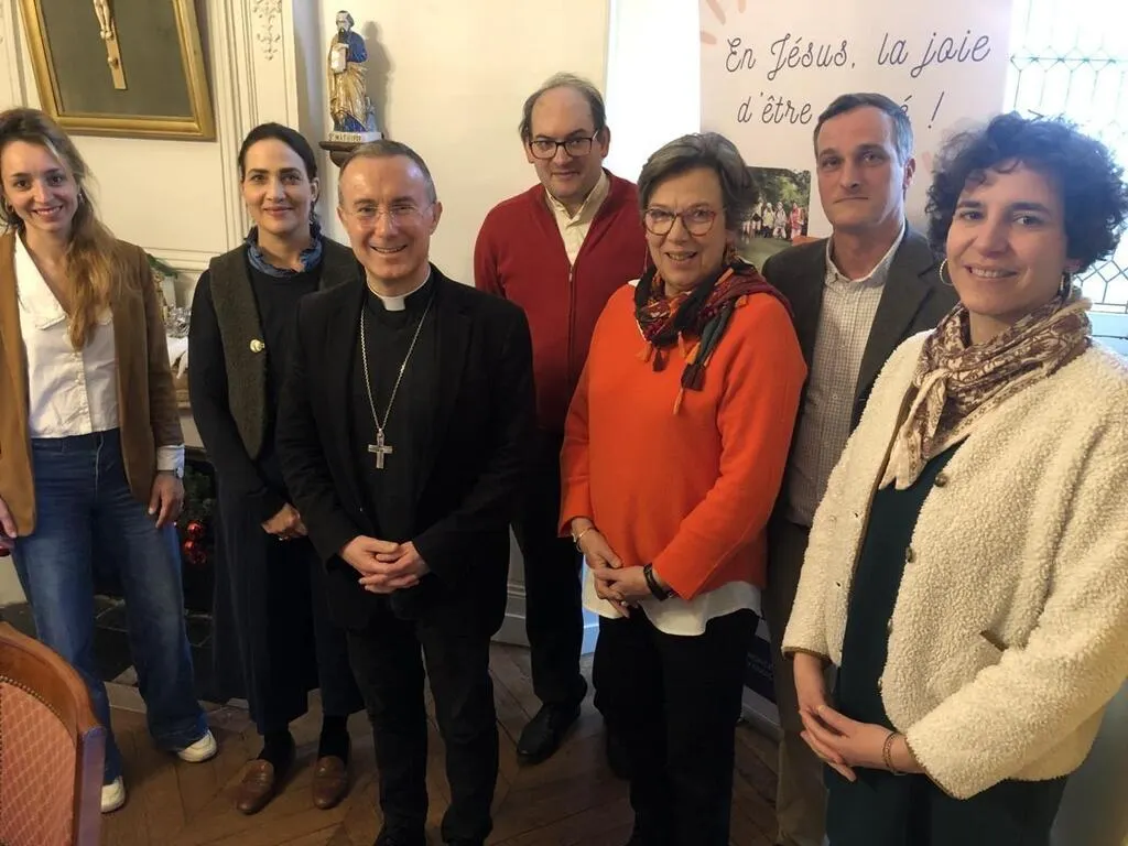 Mgr Vuillemin, évêque du Mans, avec l’équipe du diocèse: Albane du Rosel, chargée de communication, Stéphanie Valentin, responsable Ressources, Père Benoit Pierre, Vicaire général, Marie Roquebert, Responsable du service diocésain pour le tourisme, Bruno de Labarthe, économe, Elisabeth Gac, coordinatrice des animateurs pastoraux pour l’enseignement catholique. © Le Maine Libre