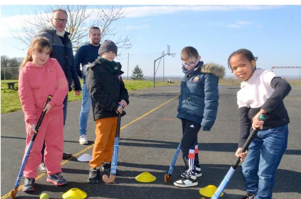 Comme ici avec le hockey, l’école Saint-Paul bénéficie d’interventions sportives financées par la communauté de communes. © Le Maine Libre