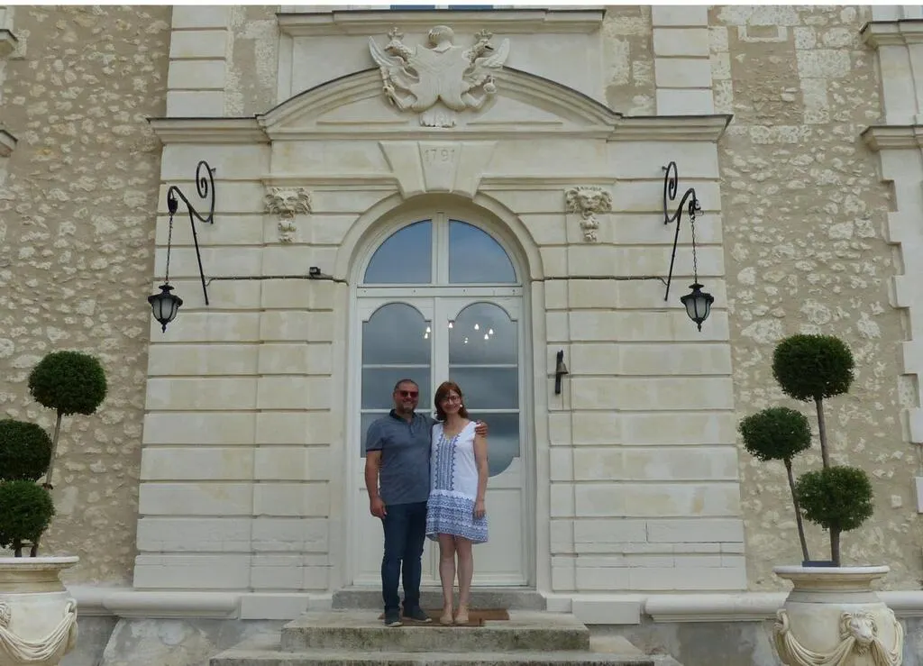 Fady Fadel et Cynthia Heide-Fadel devant l’entrée principale du château. L’année 1791, gravée sur la façade, est celle de la rénovation après la révolution de 1789. © Ouest-France