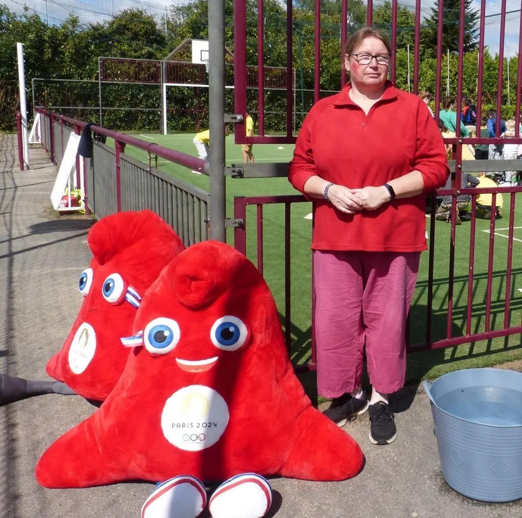 Emmanuelle Bultel, directrice à l’Accueil de loisirs d’Oizé avec les mascottes des JO. © Le Maine Libre
