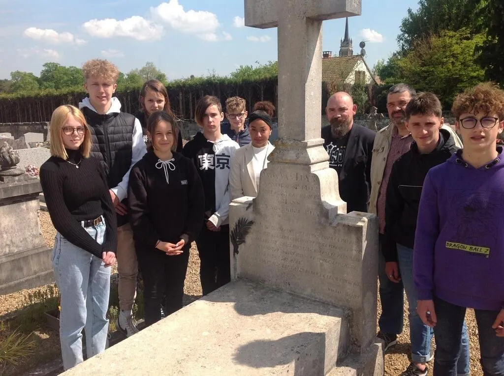 En mai, une vingtaine de collégiens de Nazareth ont restauré la tombe d’Yvon Van Luyn, tombé à 21 ans. © Le Maine Libre
