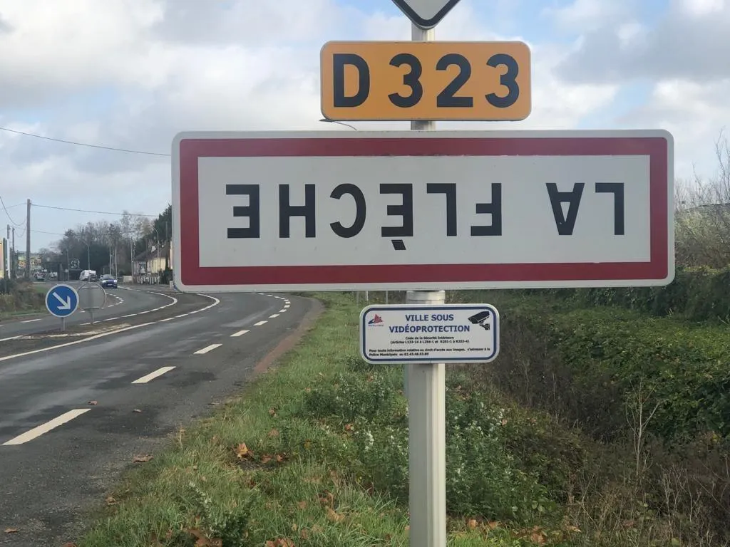 Les Jeunes agriculteurs du canton de La Flèche ont retourné plusieurs panneaux d’entrée d’agglomération ce dimanche 19 novembre. © Le Maine Libre