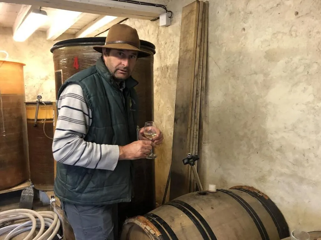 Philippe Rossignol, dans son chai, pour tester son chardonnay, qu’il fait vieillir en fût de chêne. © Ouest-France
