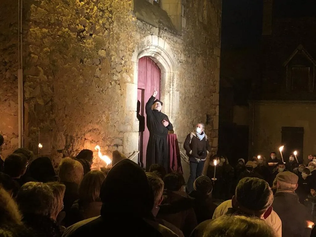 La troupe des Vilains, ici lors de l’animation Cités en lumière en décembre 2021, avait joué quelques saynètes au travers du village. © Photo : Ouest-France