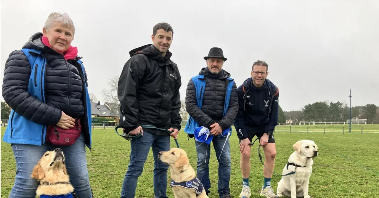 Les bénévoles et les trois chiens présents : Audi, Athena et Vidocq. © Le Maine Libre