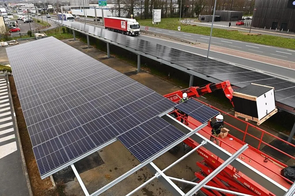 Installation d’ombrières photovoltaïques par la société See You Sun, filiale de Cénovia. © Archives Ouest-France/Franck Dubray