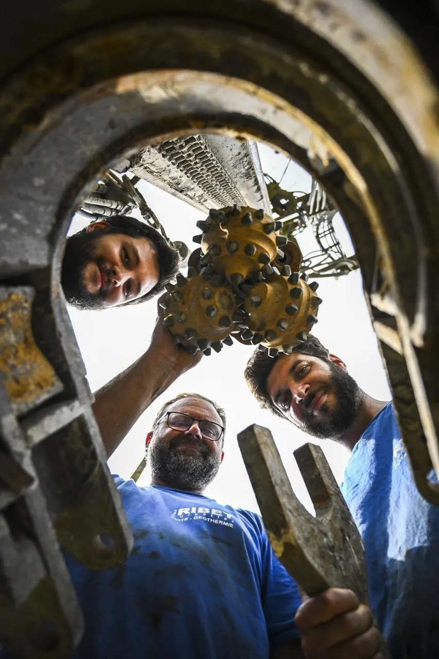 Requeil, jeudi 20 juin 2024. L’entreprise de Pascal Ribet (au premier plan) est très sollicitée. Le puisatier s’est diversifié dans la géothermie. © Le Maine Libre – Denis LAMBERT