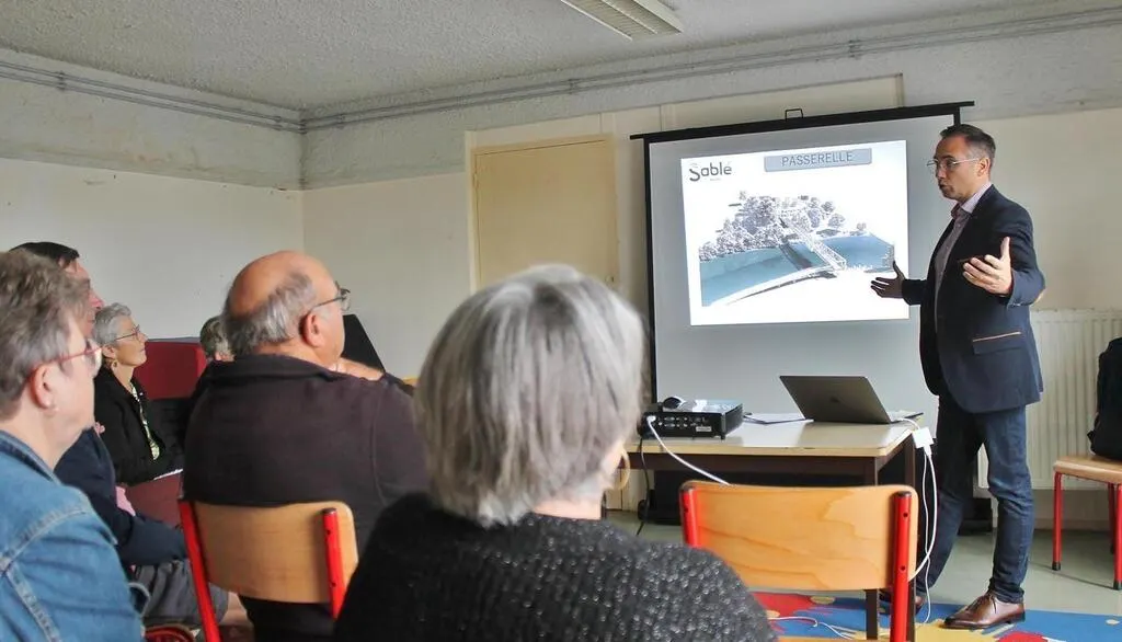 Nicolas Leudière, le maire, lors d’une présentation du projet de passerelle dans une réunion de quartier, en octobre 2023, à Sablé-sur-Sarthe. Archives Ouest-France