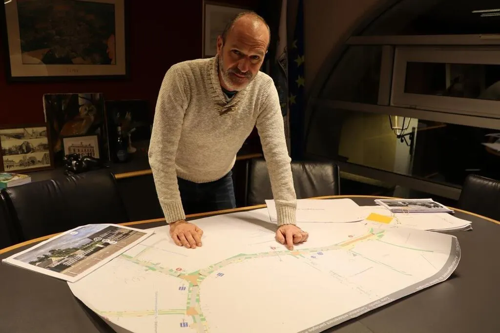 Anthony Mussard, le maire de Loué, présente le plan du futur aménagement du quartier de l’église, le grand projet de l’année 2025. © Ouest-France