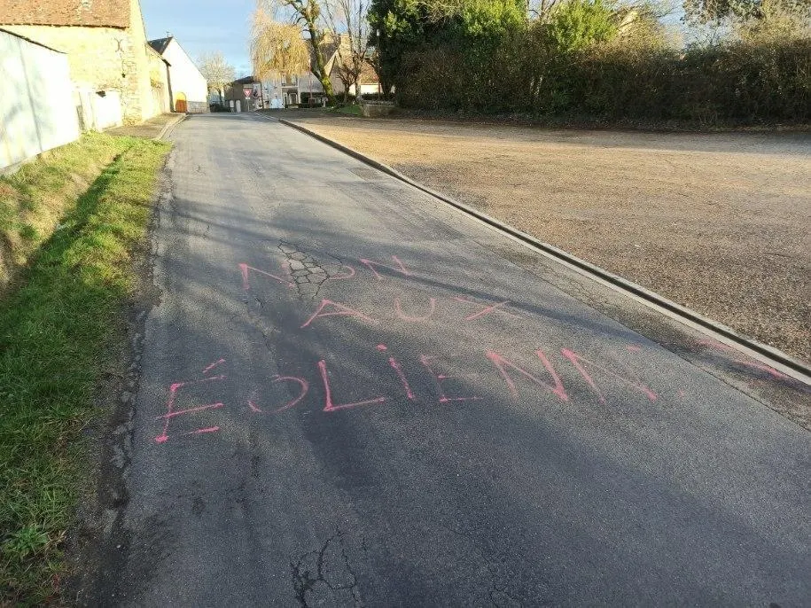 Un message a été tagué, mardi, sur la route qui passe devant la salle polyvalente de Ligron, où s’est tenu le comité de concertation. La porte-parole de Sauvons les Garennes de Saars indique qu’il ne s’agit pas d’une action revendiquée par le collectif. © OUEST-FRANCE