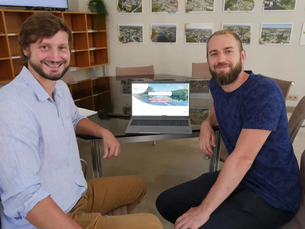 Nicolas Hanzel, à gauche, travaillant pour la société Pencil park et Renaud Derrien, chargé de projets multimédia à la communauté de communes du Pays sabolien, ont élaboré le site internet de la communauté de communes qui sera accessible ce jeudi 1er septembre 2022. © Le Maine Libre