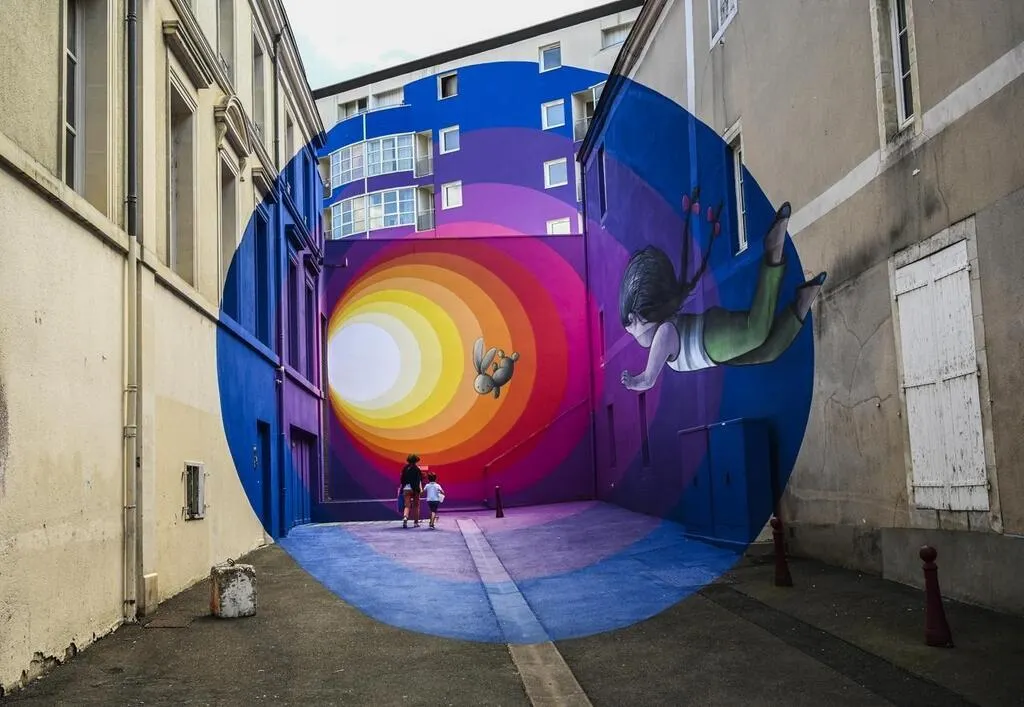 Dans une impasse de la rue Jankowski, en plein centre-ville, on y voit une enfant poursuivre un lapin blanc dans un tunnel lumineux. L’œuvre a été peinte en mai et juin 2022 sur plusieurs bâtiments, et il faut se positionner à un endroit précis pour profiter pleinement de cette œuvre impressionnante.