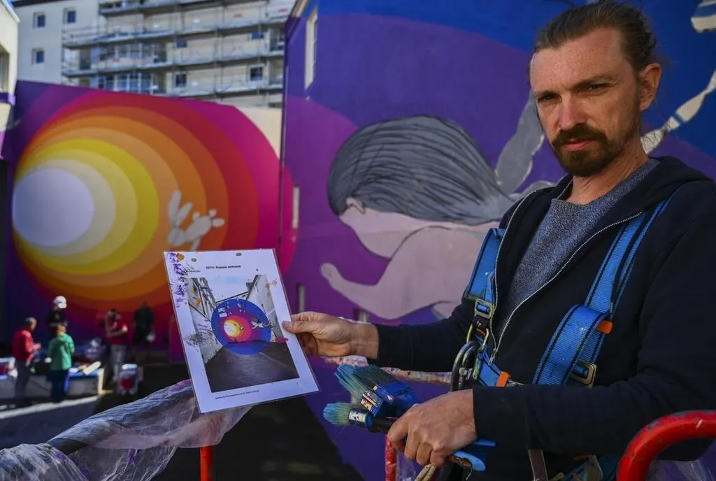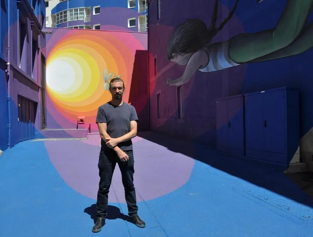 Julien Malland, alias Seth, devant son œuvre terminée, impasse Jankowski. archives Le Maine Libre