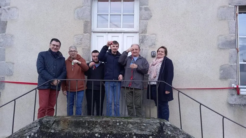 André, Jordan, Bryan et Dominique, entre Philippe Rallu, maire, et Anne Denis, directrice du foyer Anaïs, sur le perron de l’habitat expérimental. © Ouest-France
