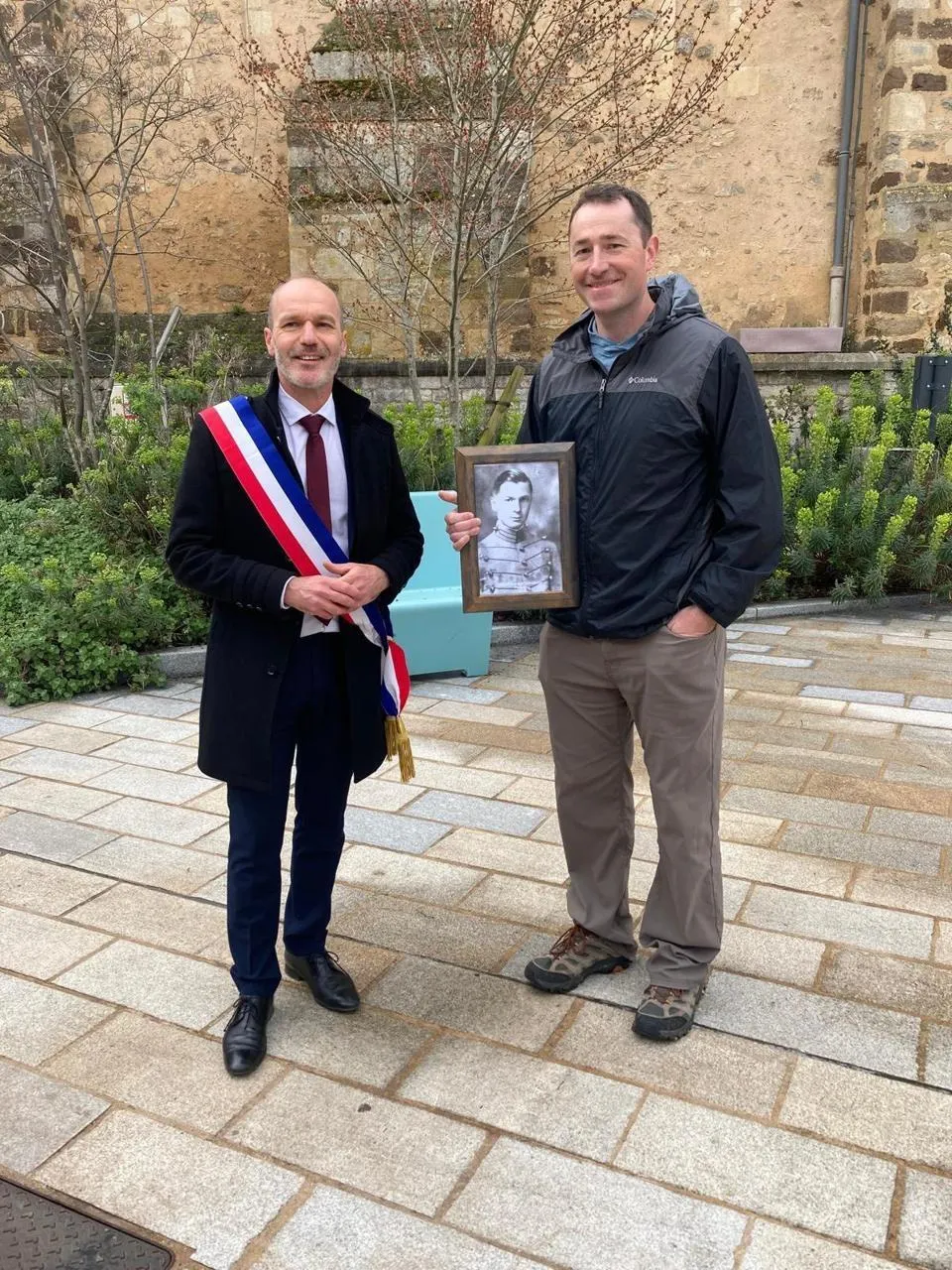 Anthony Mussard, le maire de Loué, a accueilli, vendredi 6 mars 2026, le petit-fils du colonel Donaldson, tué en 1944 à Loué. © Ville de Loué