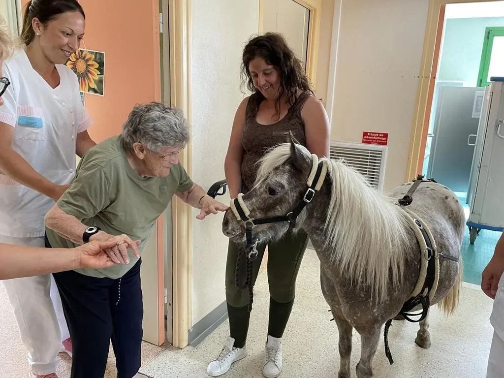 Les résidents de l’Ehpad Saint-Julien de La Ferté-Bernard (Sarthe) ont eu la joie de recevoir ce 26 juin 2023 la visite de Plume, une ponette shetland. Un moment de bonheur absolu qui a aussi donné le sourire à tout le personnel. Les visites de l’équidé se poursuivront dans les semaines à venir.