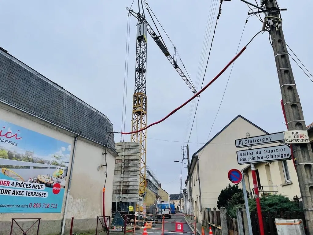 La grue d’un chantier situé rue de la Blanchisserie, au Mans, a endommagé des lignes à basse tension. © Le Maine Libre