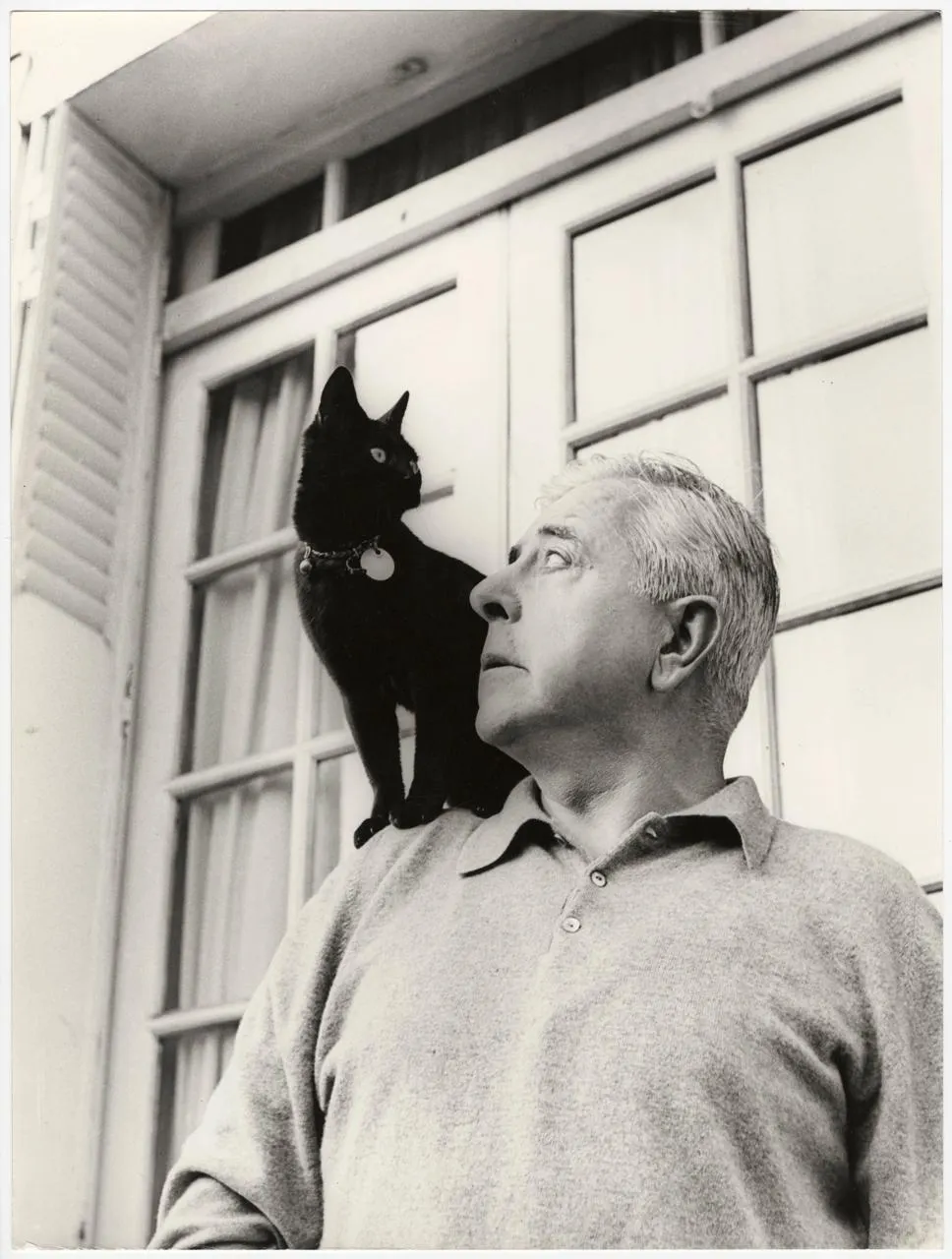 Jacques Prévert et sa chatte Agathe, sur la terrasse de la cité Véron par André Villers. CD50 archives