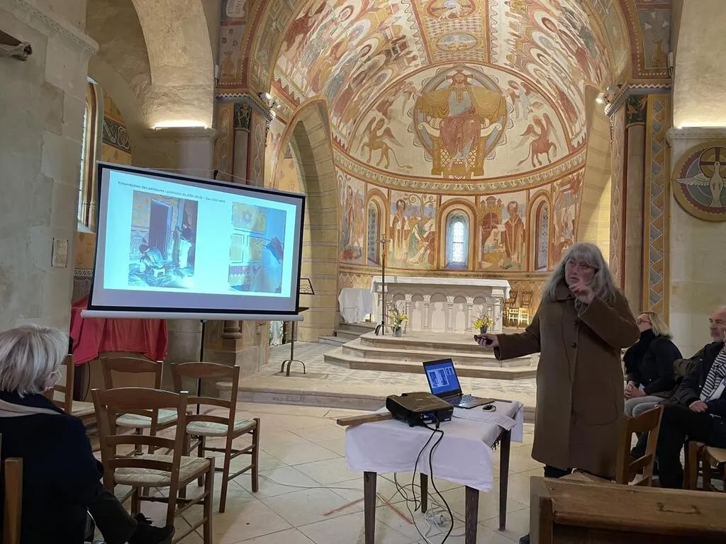 Samedi 19 mars 2022 dans le cadre des « Rendez-vous autour de La Chartre », Véronique Legoux présentait, devant une cinquantaine de personnes, les travaux de restauration des fresques qu’elle a dirigés dans l’église Saint-Julien de Poncé.