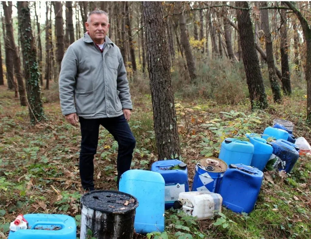 Patrick Bouttier pose près des bidons déposés dans un sous-bois. © Le Maine Libre