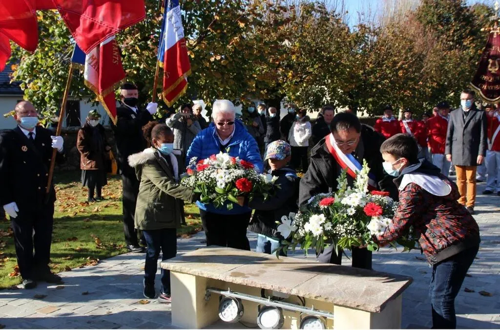 Dépôt de gerbes sur la banquette aménagée devant le monument aux morts, qui est désormais illuminé toutes les nuits. © Le Maine Libre
