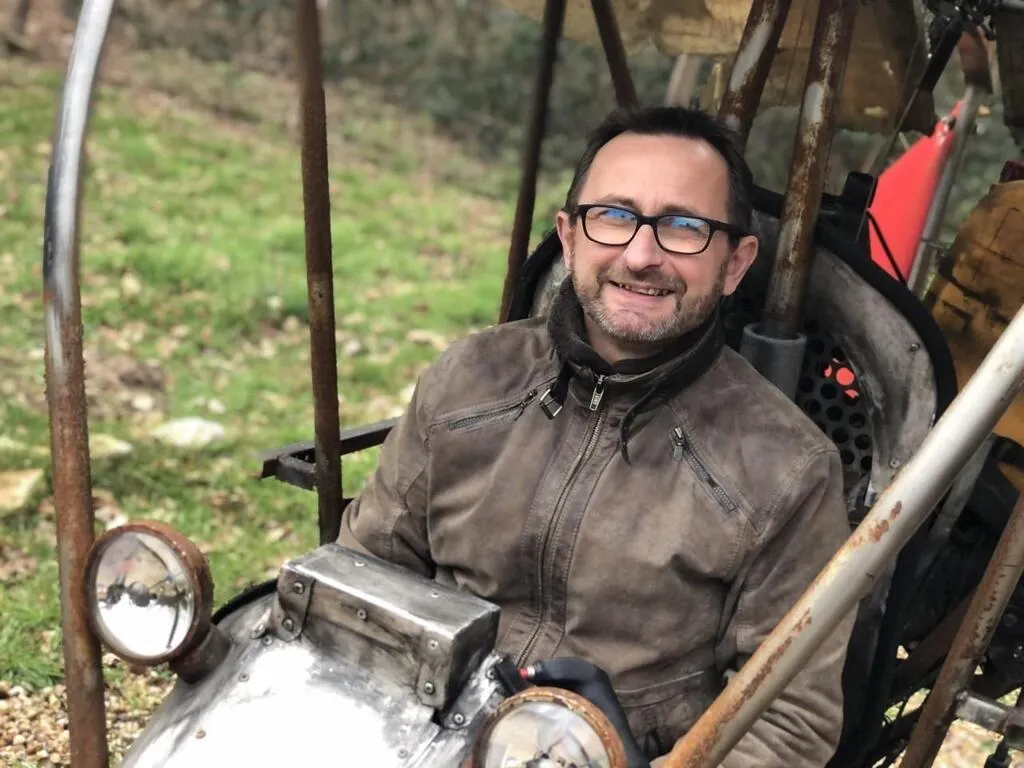 La machine volante du Cygne des héros est posée dans le jardin de la longère familiale. Près des bois, en pleine campagne, à quelques kilomètres de Challes (Sarthe). J’y étais le directeur de l’école pendant dix ans