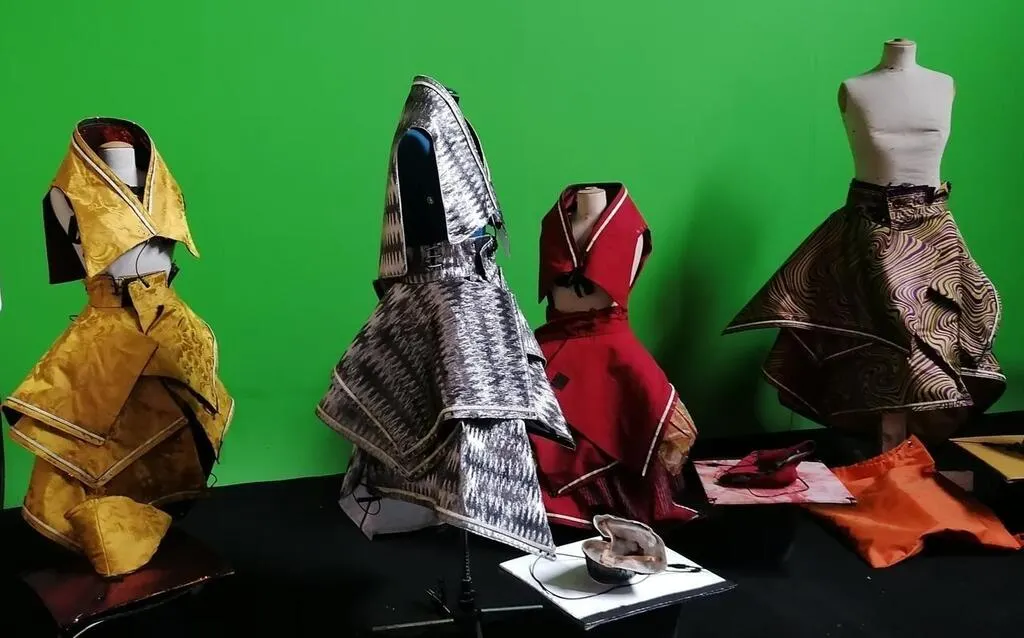 Une machine à coudre résonne dans l’atelier. Sur la table de travail, un pantalon à bretelles gris métallique, ressemblant à une combinaison de cosmonaute, à l’exception des jambes, longues de plusieurs mètres. C’est un costume pour notre prochain spectacle. Il est fait pour être mis avec des échasses