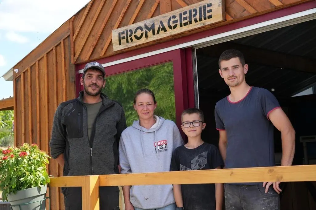 La famille Delaroue Valentin, Éloïse et Nohan et leur employé Clément viennent d’ouvrir la fromagerie voisine au Pop corn labyrinthe, samedi 5 juillet 2025 à Trangé (Sarthe). © Ouest-France