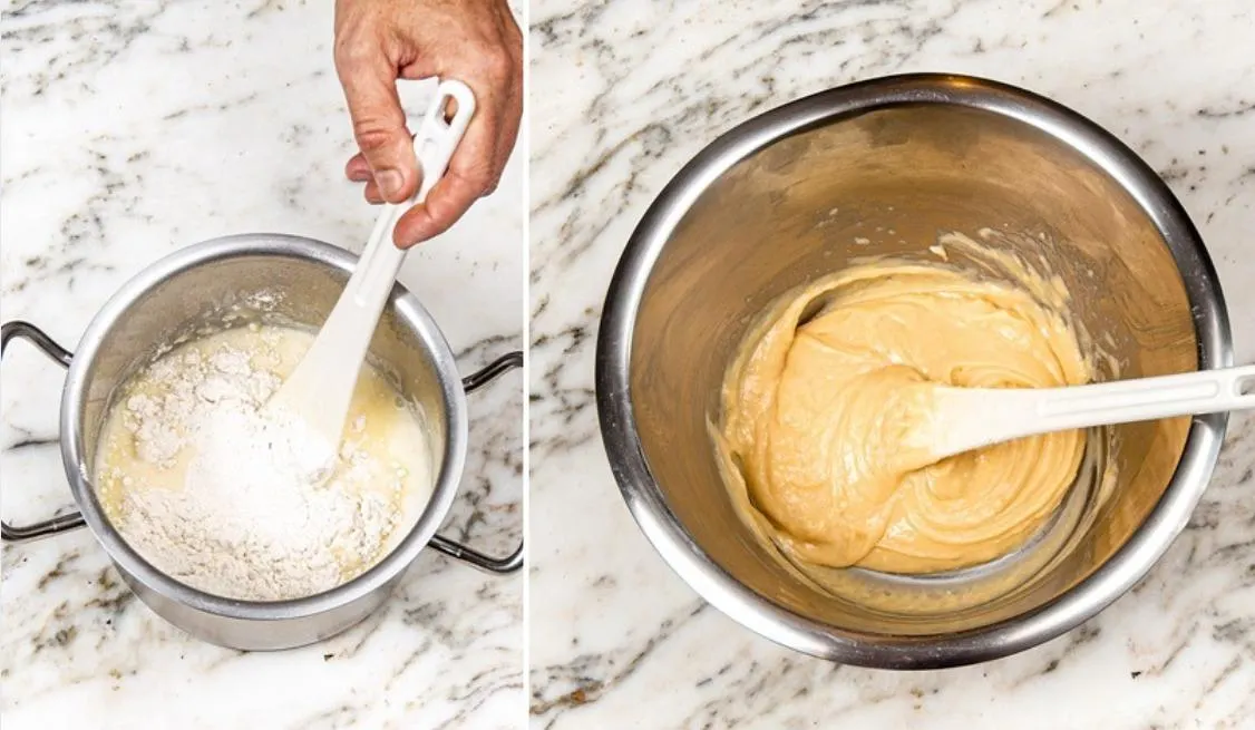 Après avoir ajouté la farine et desséché la pâte, ajouter hors du feu les œufs battus et mélanger jusqu’à ce que la texture soit lisse. Olivier MARIE / Bretons en Cuisine