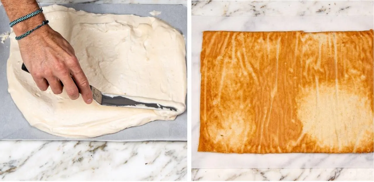 À la sortie du four, laisser refroidir le biscuit sur sa feuille. Une fois à température ambiante, décoller délicatement la feuille et réserver le biscuit sous un torchon propre pour qu’il ne se dessèche pas.