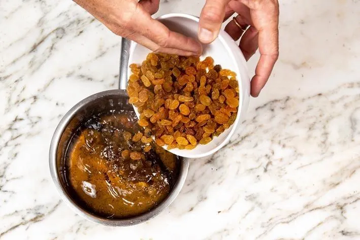 Finir de décorer avec des raisins gonflés et des bâtonnets découpés dans une gousse de vanille.