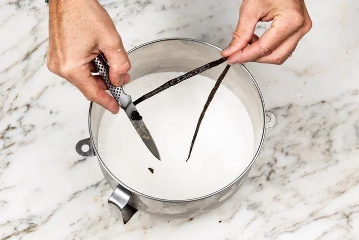 Gratter les graines de vanille dans la crème. Olivier MARIE / Bretons en Cuisine