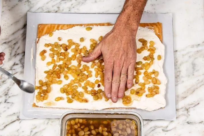 Déposer généreusement des raisins gonflés de sirop au rhum sur la crème (les égoutter un peu avant). Rouler le biscuit avec l’aide du papier sulfurisé. Filmer puis égaliser les deux bouts. Réserver au frais.
