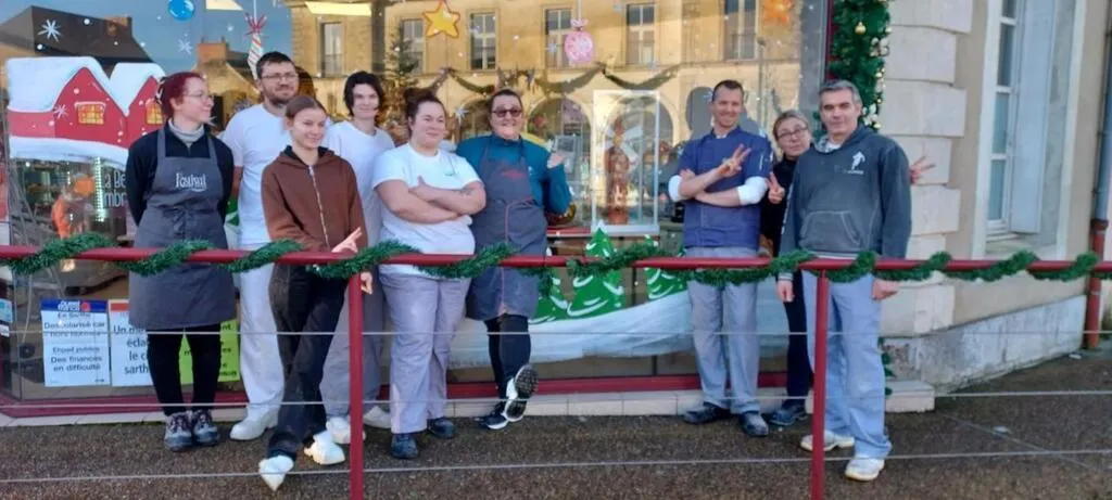 Une partie du personnel d’Au P’tit Moulin, la boulangerie de Brûlon en compagnie des gérants Estelle et Arnaud Gaulard (à droite) © Ouest-France