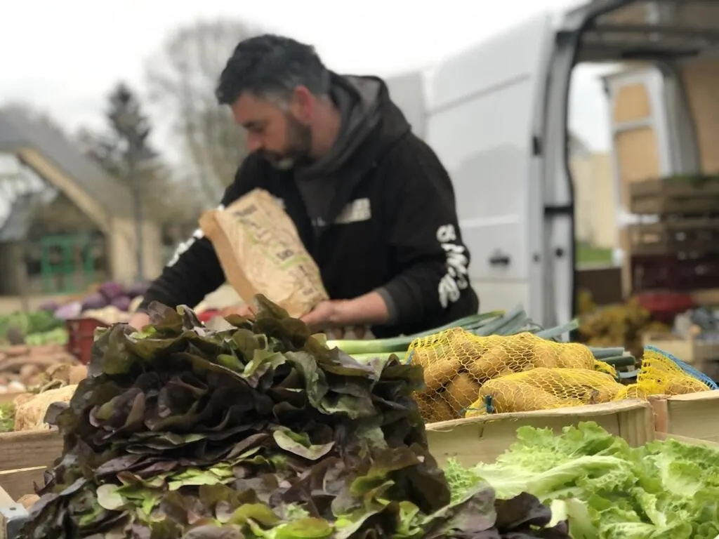 Bertrand Chartier, maraîcher bio à Saint-Gervais-en-Belin, vient tous les dimanches au marché de La Milesse. © Le Maine Libre