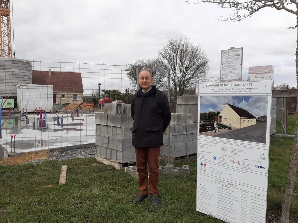 Claude Davy, maire de Notre-Dame-du-Pé depuis 2001, devant les fondations de la maison d’assistantes maternelles qui ouvrira au printemps 2023. © Le Maine Libre