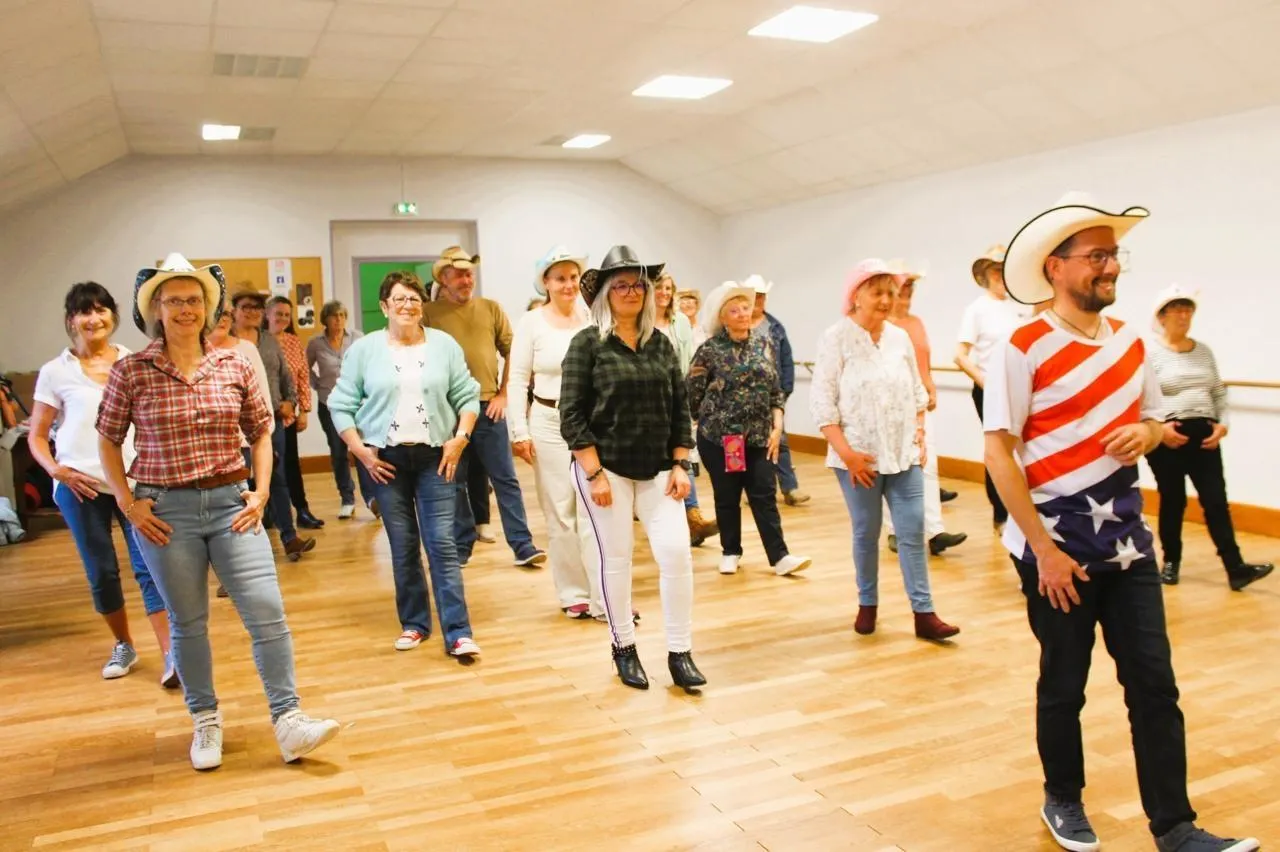 Lors de l’opération portes ouvertes, Anthony Hubert (à droite) a encadré le cours de danse country tandis que Cécile Dupont (à gauche, en chemise à carreaux) a suivi les participants avec attention. © Le Maine Libre