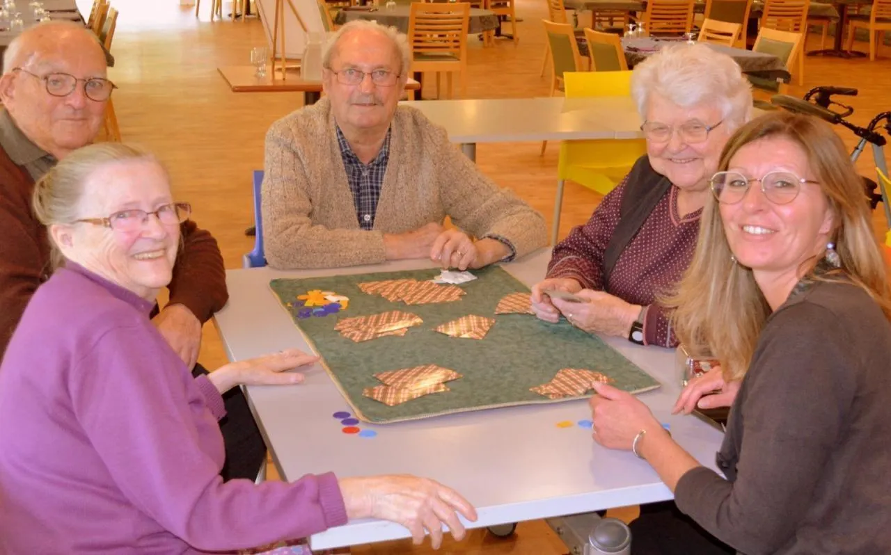 Les participants ont joué aux jeux de société dans une joyeuse ambiance, ici avec Nadège Deniau, animatrice de la résidence. © Le Maine Libre
