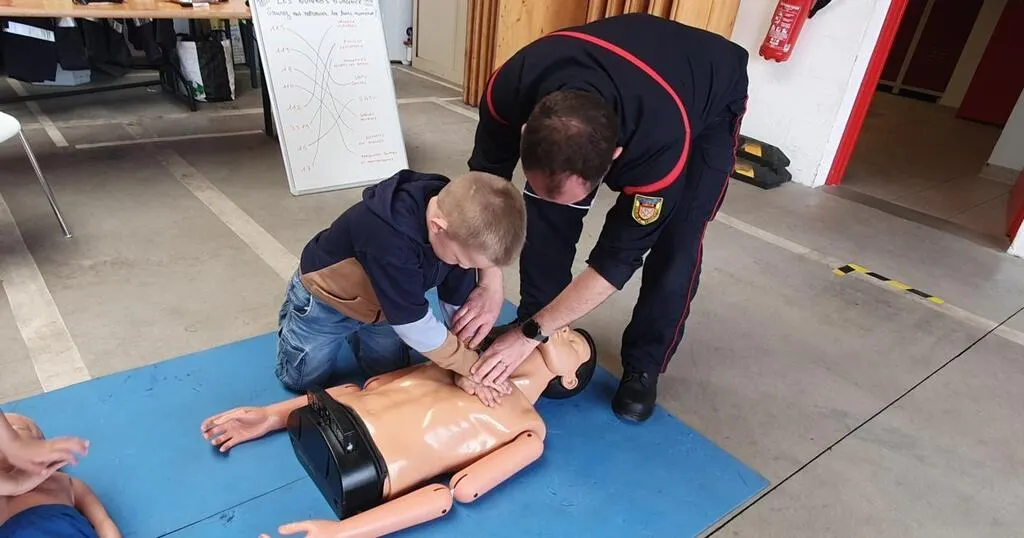 Un pompier volontaire montrant les gestes de premiers secours a un jeune visiteur. © Ouest-France