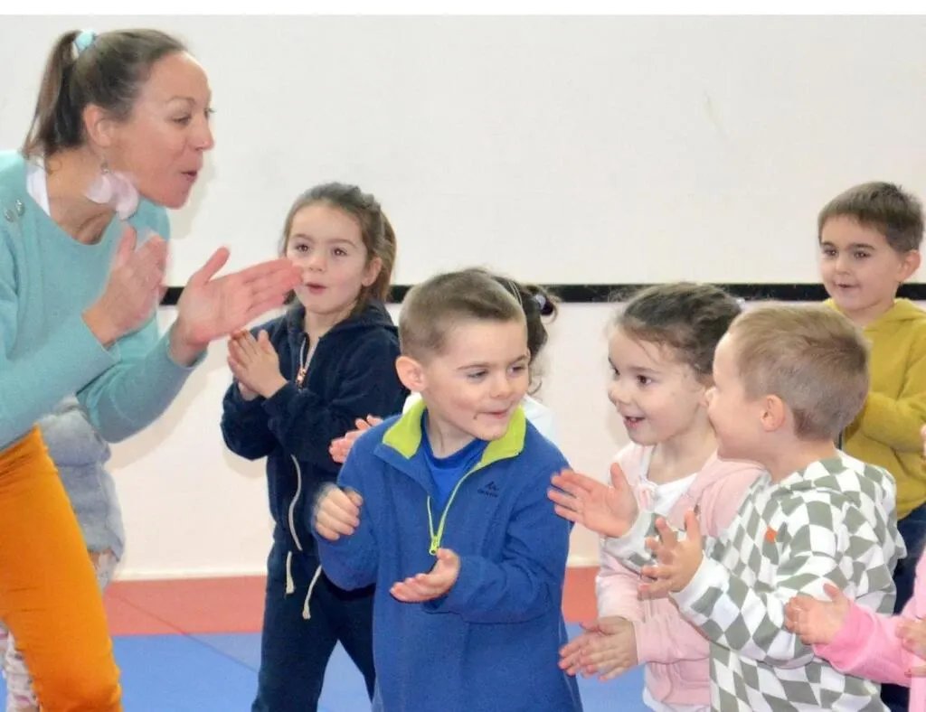 Marie Thomas a proposé aux élèves de maternelle de rire comme la petite souris ou comme le père Noël. © Le Maine Libre
