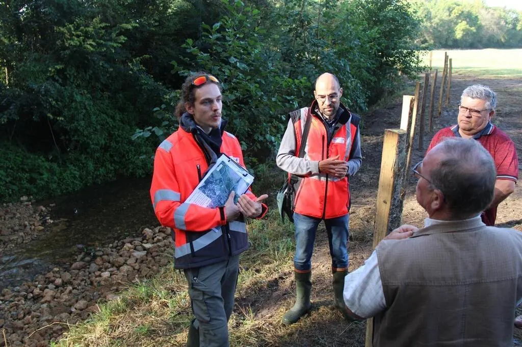 Eliakim Pearon et Willy Chéneau, du service Gemapi (Gestion des milieux aquatiques et prévention des inondations) ont présenté, cette semaine, les premiers travaux opérés sur le ruisseau des Cartes, à Thorée-les-Pins, près de La Flèche (Sarthe). © Ouest-France