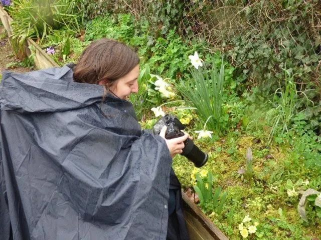 La pluie, samedi 18 mars, n’a pas facilité la tâche des photographes du club Photo sART', à Bazouges-Cré-sur-Loir. Protégée par sa cape de pluie, Angèle Barriteau photographie le cÅ“ur des jonquilles. © Ouest-France