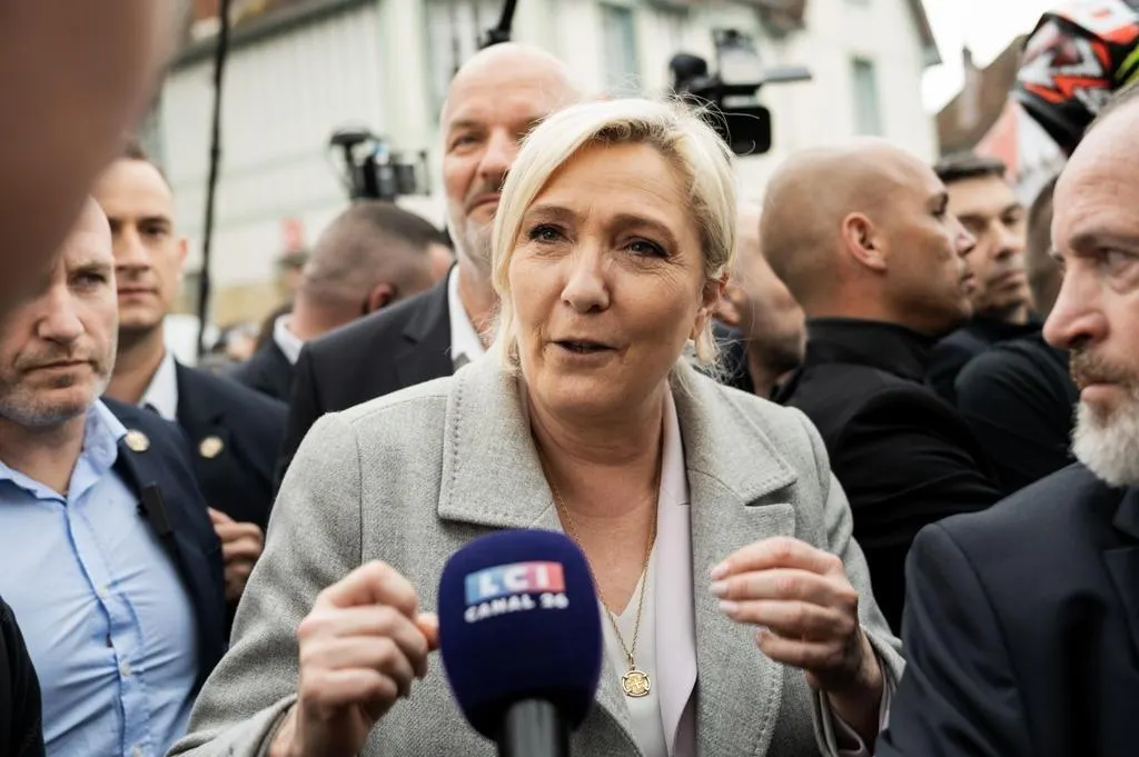 Marine Le Pen, ici lors d’un déplacement en Normandie, le 17 avril 2022, s’est imposée dans une majorité de localités de la communauté de communes LBN, au nord de Sablé-sur-Sarthe, pour le second tour de la présidentielle. © Martin Roche / Ouest-France