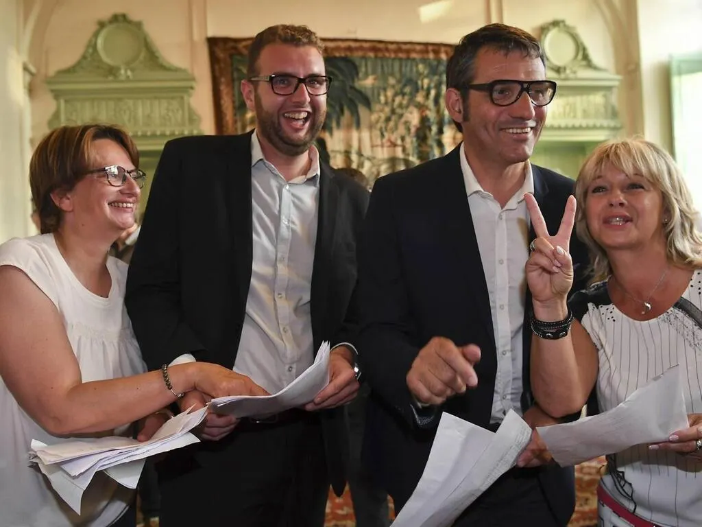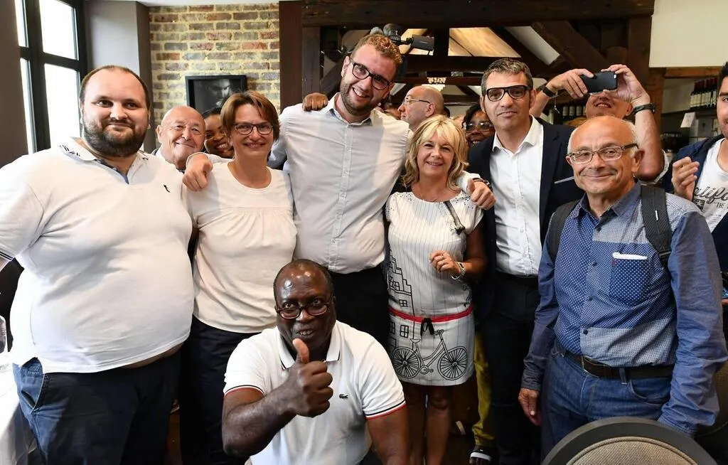 Lundi 12 juin 2017, au lendemain du premier tour des législatives, le clan macroniste savoure sa victoire. Dans un restaurant du Mans, Alexandre Dimeck-Ghione se tient avec les quatre candidats LREM sarthois, Aurélie Pérot, Damien Pichereau, Pascale Fontenel-Personne et Willy Colin. © Archives Le Maine Libre – Hervé PETITBON